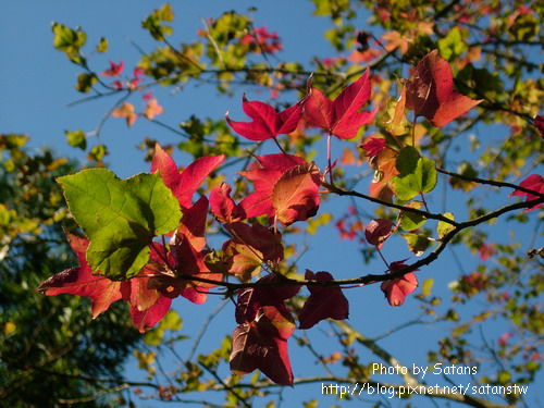 第一張與上面這張都是拍攝於陽明山國家公園遊客中心旁的兩棵青楓。這可能是全陽明山現存「紅的最漂亮」的兩棵楓樹了,不過即使如此,紅的程度也不過這樣而已,而且有些葉子還是綠色的....我不禁懷疑,這其實是剛長出來的新葉....