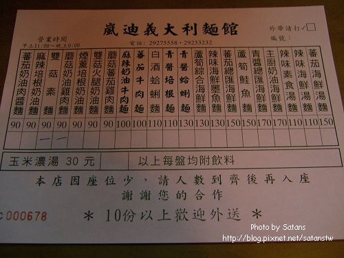 這間義大利麵館在頂溪站這邊已經開了好幾年了,剛開店的時候就因為價格很平實,所以一直都很多人來吃,以前甚至在下午三點這種下午茶時間也都有客滿的記錄,非常驚人。後來由於這間店生意實在太好,所以附近也另外開了兩間類似的義大利麵館,但對嵐迪的影響不大,生意還是一樣的好,可見這間店除了價格平實外,味道一定也很不錯。
