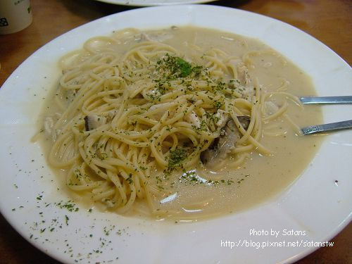 我點的蘑菇奶油雞肉麵。這樣的份量對普通人來說剛好,不會過飽。奶油味道相當重(他們茄汁口味的茄汁味道也很重),裡面有香菇、蘑菇、袖珍菇以及雞肉。我要讚揚一下他們的雞肉,軟嫩而不柴,吃起來不會乾澀粗硬,處理得不錯。上面撒的香料應該是羅勒吧?我對義大利香料很不熟,搞不太清楚....(我果然不適合當美食報導寫手)