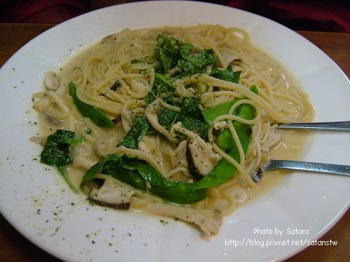 P點的雙菇素麵。除了香菇、袖珍菇外,還放了扁豆與九層塔,當然也有撒上羅勒。老實說,放扁豆是很怪的事,我只有在這間店看過義大利麵用扁豆這個素材,雖說與義大利麵搭配吃起來還可以接受,但扁豆味道與奶油醬汁其實不太合。